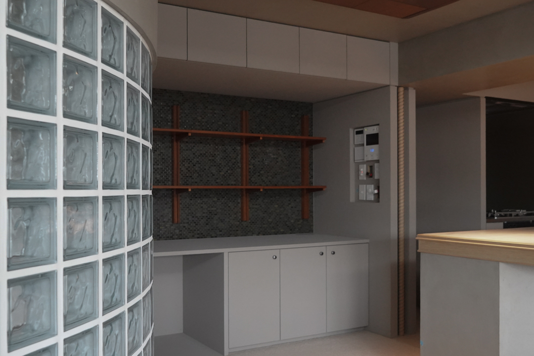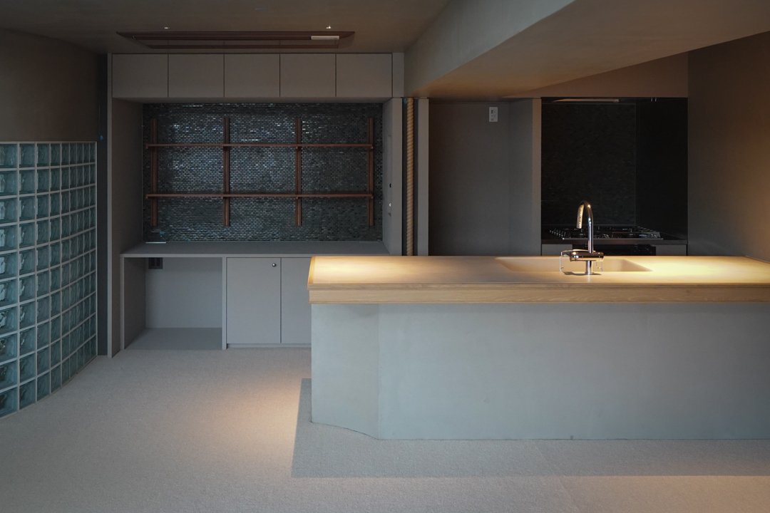 Size: w2400 d950 h850 Material: コーリアン/メラミン化粧板仕上げ painting: 左官仕上げ