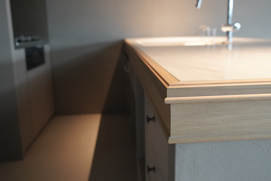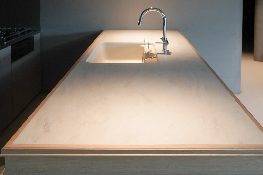 コーリアンの天板と左官仕上げを組み合わせたキッチンになります。