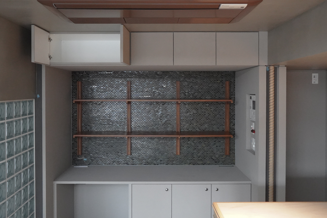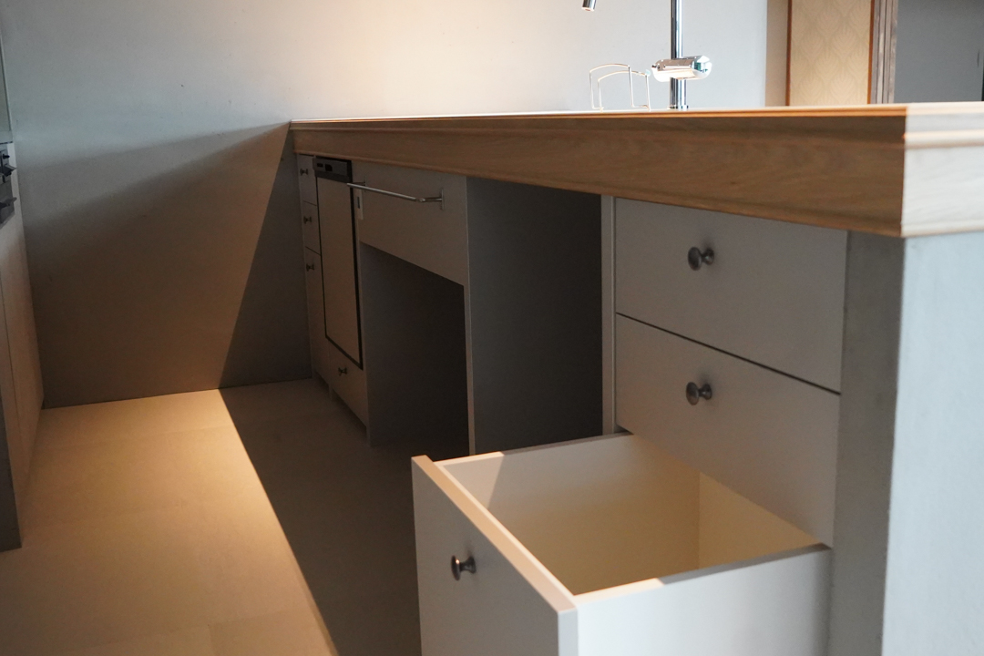 背面の食器棚はOSB仕上げに塗装仕上げになります。
