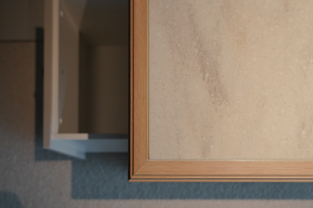 外側は左官仕上げ、内側は同色のメラミン化粧板で仕上げてあります。